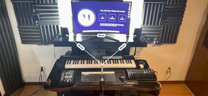 Be careful at the triangle as Allan said. Tweeter have to be in the direction of your ears. It's depend how tall you are but it seems to be very high. To respect the triangle and the position, I turn the monitors. Normally, those monitors have to be from 1.50 meters from the wall too.
